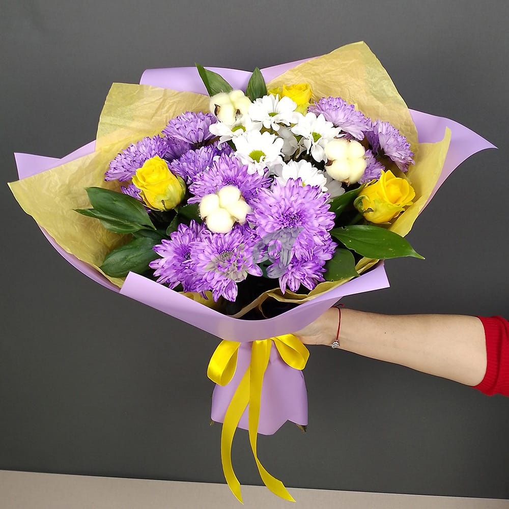 Состав и характеристики букета из роз и хризантем "Мозайка":